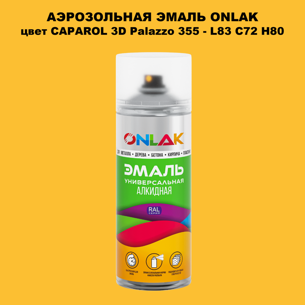 Аэрозольная алкидная краска ONLAK колерована по каталогу цветов CAPAROL 3D и служит для быстрого и равномерного окрашивания металлов, дерева, бетона, пластика, стекла.