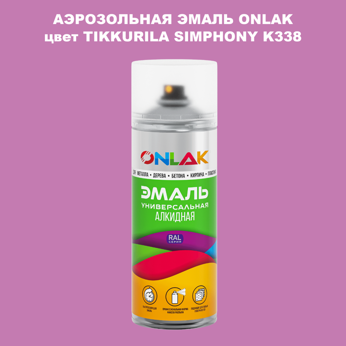 Аэрозольная алкидная краска ONLAK колерована по каталогу цветов TIKKURILA SYMPHONY и служит для быстрого и равномерного окрашивания металлов, дерева, бетона, пластика, стекла.