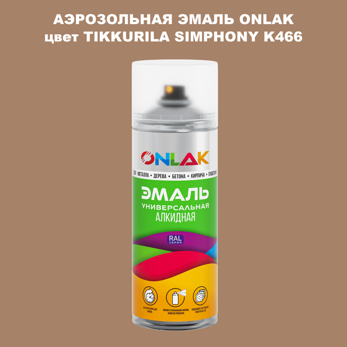 Аэрозольная алкидная краска ONLAK колерована по каталогу цветов TIKKURILA SYMPHONY и служит для быстрого и равномерного окрашивания металлов, дерева, бетона, пластика, стекла.