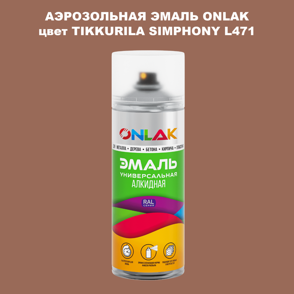 Аэрозольная алкидная краска ONLAK колерована по каталогу цветов TIKKURILA SYMPHONY и служит для быстрого и равномерного окрашивания металлов, дерева, бетона, пластика, стекла.