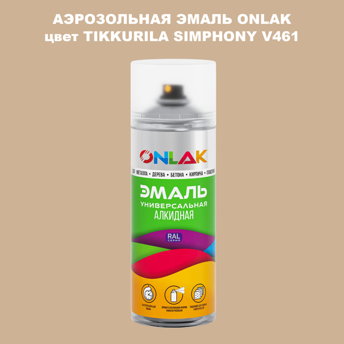Аэрозольная алкидная краска ONLAK колерована по каталогу цветов TIKKURILA SYMPHONY и служит для быстрого и равномерного окрашивания металлов, дерева, бетона, пластика, стекла.